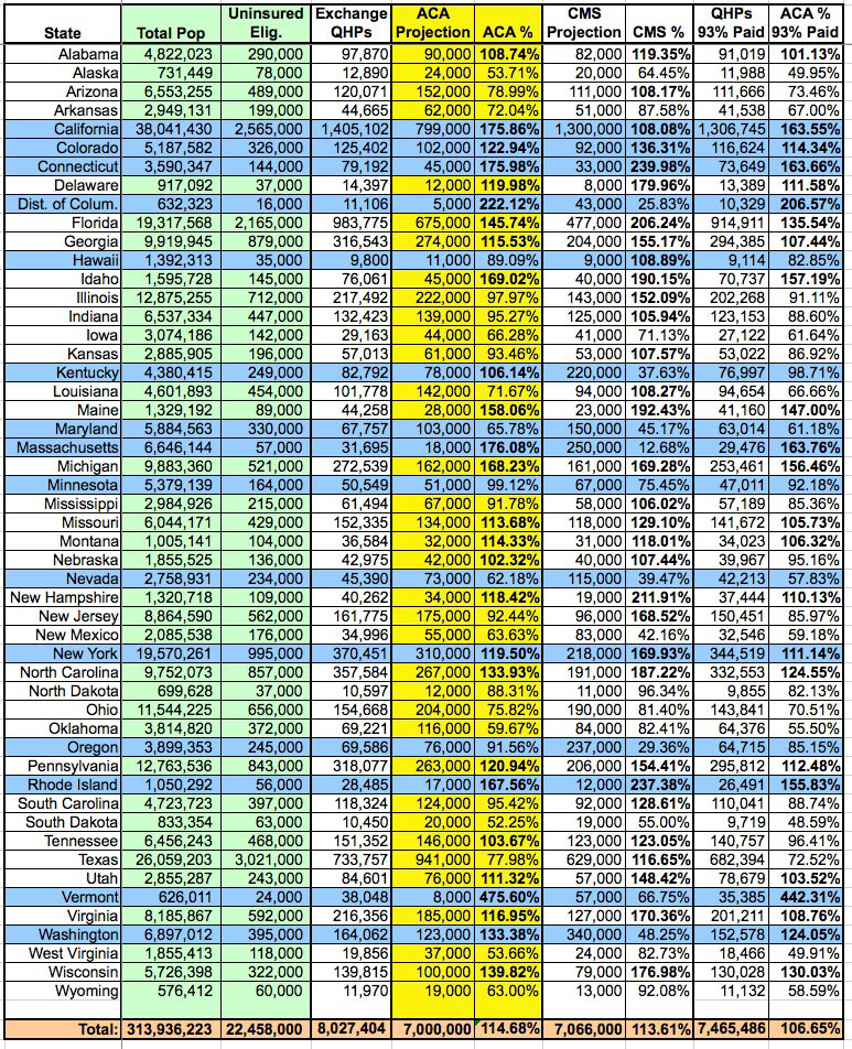 New York's final QHP tally ended up being 370,451. The CMS's original state-level target for New York was only 218,000...and that was assuming the higher, 7 million national figure. You'd have to more than double 370K to 741,000 for it to only hit 49%.