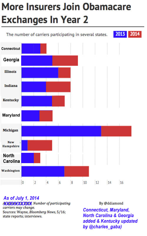 Also, you may recall a nice graph by Dan Diamond from a couple of weeks back showing the states which are increasing their exchange competition for 2015; I've crudely updated it with new competition data from 4 additional states: Connecticut, Maryland, North Carolina and Georgia (plus one more added to Kentucky since he posted it):