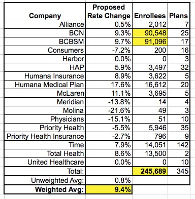 Furthermore, these two companies are asking for increases of 9.3% and 9.7% respectively. Obviously, assuming the rate increases are approved, the 9.3-9.7% increase from those two is going to impact a hell of a lot more people than, say, the 22% decrease requested by Molina...which only has 49 people enrolled.