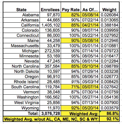 2. Next, he points out that removing 6 of the "old" states while keeping the 3 "old" ones which have 100% payment rates is "cherry-picking". OK, fair point, although the reason I keep these is because, at least in the case of MA and WA, that 100% rate has no chance of going down or up regardless of how out of date it is; those states require you to pay as part of the enrollment process itself. Still, his point is valid re. Connecticut, so for the hell of it I removed all 3 as well and sure enough, it does drop down...to 89%. I'll have to think this one over.