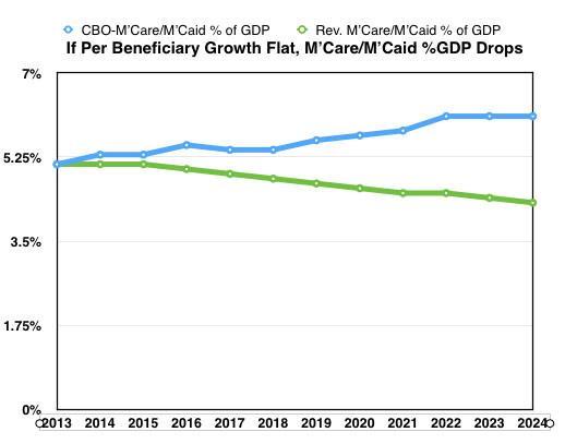 The charts above deal with Medicare per beneficiary cost growth. Information is less plentiful for Medicaid per capita spending, due to high turnover in the membership base, but here is a chart put together from a number of CBO Medicaid Focus Briefs put out before the annual 10 year Budget Outlook, generally published in March each year. Here we see per beneficiary Medicaid costs declining: