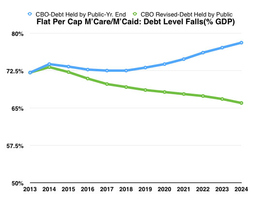Because Medicare and Medicaid take a decreasing share of our resources, deficits gradually decline, moving below the rate of GDP growth (and staying there), thus allowing the Debt/GDP ratio to decline.