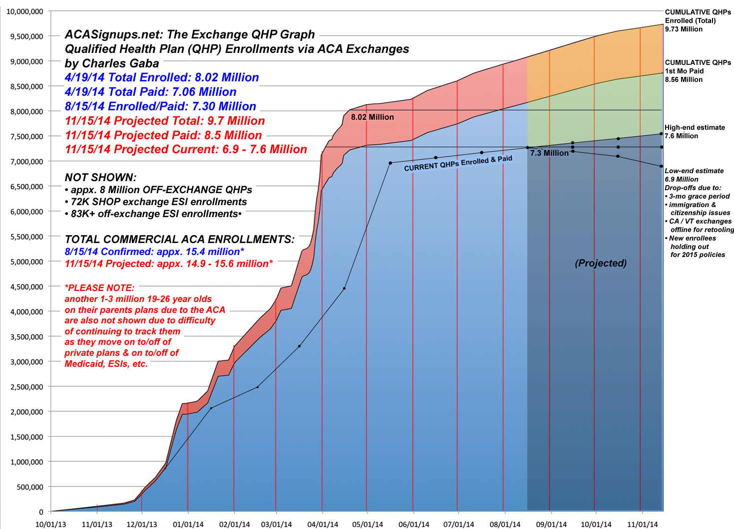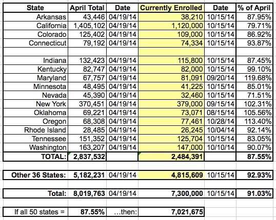 I still stand by this, but an extensive discussion with Jed Graham of Investors Business Daily made me realize that presenting it this way can lead to confusion, because I'm essentially mixing together two different estimated numbers (% paid & attrition rate), each of which may vary widely from state to state, instead of simply comparing the number of people currently enrolled against the 8.02 million who had enrolled (whether paid up yet or not) as of April 19th.