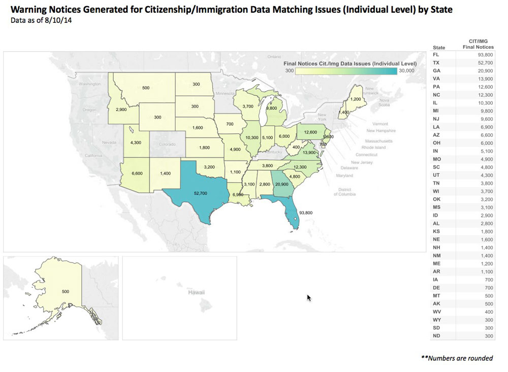 Secondly, look at California. I wrote up an entire article over at healthinsurance.org about California's own immigration/citizenship data issues...and in their case, out of over 148,000 enrollees who originally had problems, only 7% ended up actually having their policies cancelled in the end (87% were resolved without cancellation; another 6% awere still under review at that time).