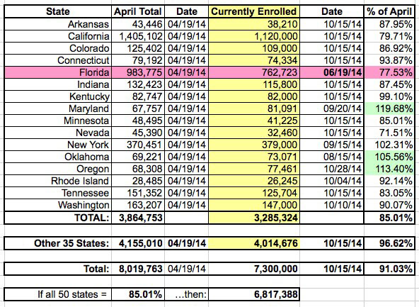I also noted that there are two problems with the Florida data: First, that it's had significantly more dropoff (22.5%) from the official April figure than any of the other states listed (with the exception of Nevada, which has had its own technical headaches to the point that it's dropping its exchange entirely).