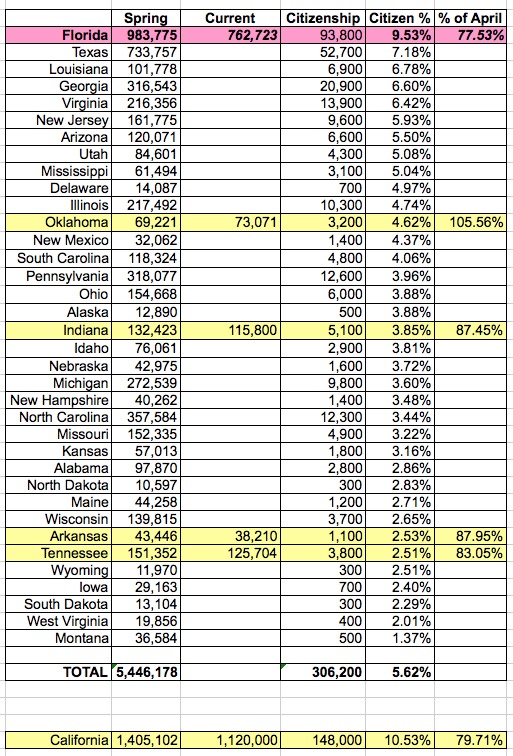 In short, if the immigration/citizenship data issue is a major factor after all, then the current enrollee number might be lower than 6.8 million...but that's still impossible to tell with the data at hand. The absolute worst-case theoretical scenario here would be if every single one of the 199K people shown in non-highlighted states above has been dropped, which is ludicrous--there's no reason why a higher percentage of immigrants in Texas or Georgia would be likely to have data discrepancies than in Florida.