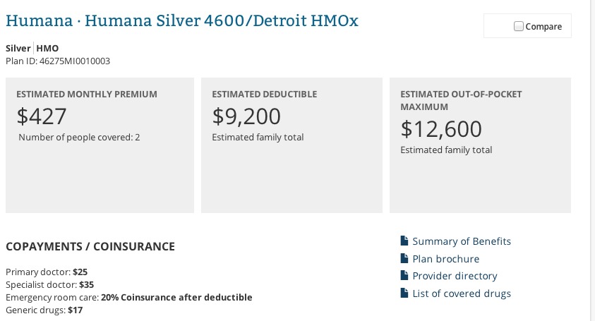 Now, I may be off on this last point; the only way I could "simulate" the same family income without the APTC was to jack their income up on the calculator to $100K, so the HC.gov calculator results may be messed up accordingly. However, if I'm correct about this, the maximum costs to the theoretical Michigan family above just changed as follows: