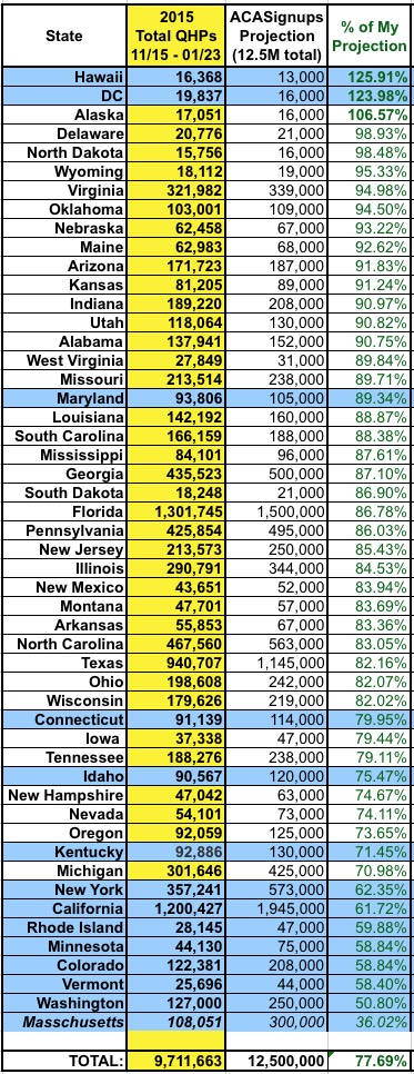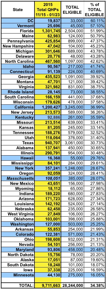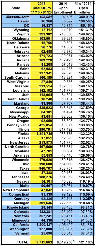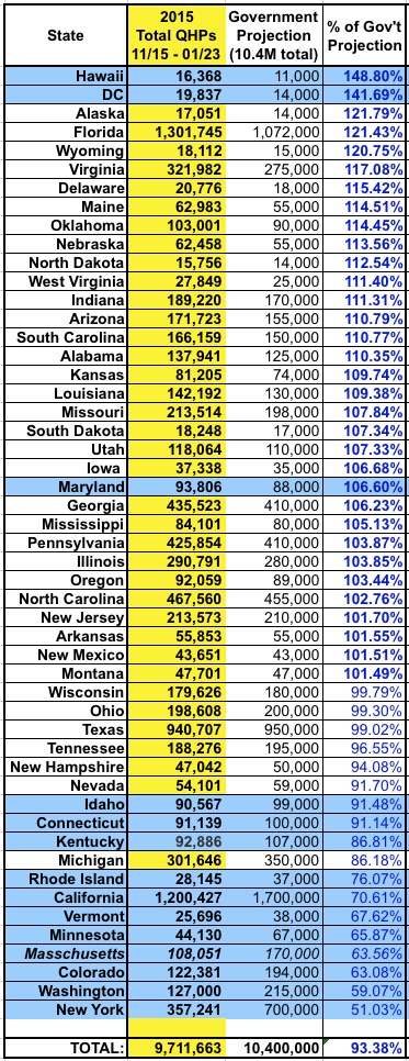 In Florida, however, they did have an "official" target: 1,072,000 QHPs. In act, it was even more specific: 1,072,513, according to the Florida Office of Insurance Regulation. How they arrived at such a specific number I have no idea, but that's what they published last June, so there you have it. Since 1.072M would only be a 9% bump over 2014, it didnt' take much to surpass that goal.