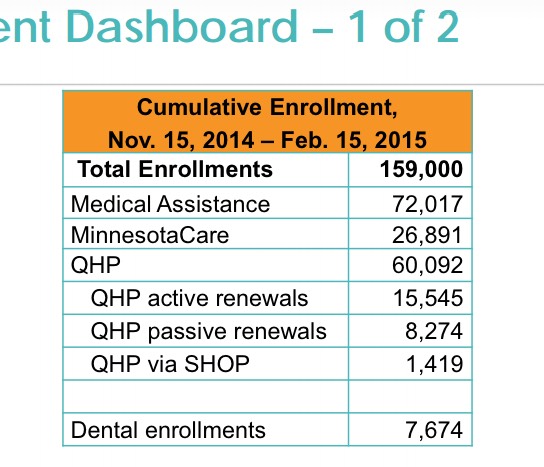 Today, MNsure announced 159,000 Minnesotans enrolled in quality, affordable health insurance coverage through the state marketplace during the 2015 open enrollment period, November 15, 2014, through February 15, 2015. This includes 60,092 qualified health plan (QHP) enrollments, 26,891 new MinnesotaCare enrollees and 72,017 new Medical Assistance enrollees. The qualified health plan total includes both individual and Small Business Health Options Program (SHOP) enrollments.
