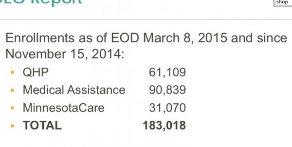 Minnesota reported 59,704 QHP selections as of 2/21/15. As of March 8th they're reporting 61,109 (the text above reads 3/12 but the actual dashboard report makes it clear that the actual data was through 3/08):