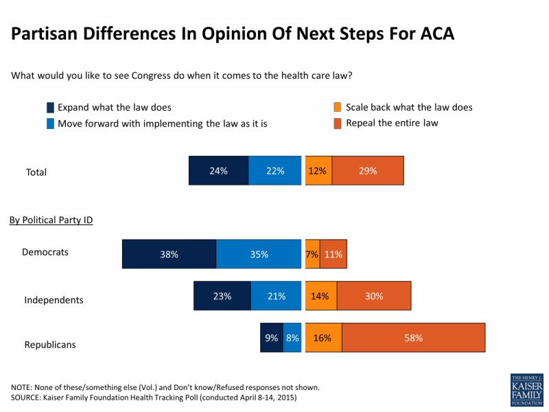 The public continues to be divided about what they would like to see Congress do next with the law. Just under half want Congress to either expand what the law does (24 percent) or continue implementing it as is (22 percent), while about 4 in 10 want to see Congress either scale back the law (12 percent) or repeal it entirely (29 percent). These shares have remained constant for nearly six months.
