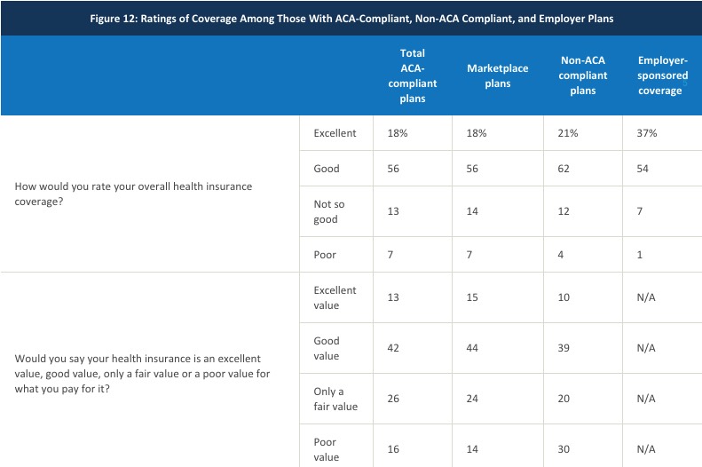 Another noteworthy point: The "excellent/good" rating for non-ACA compliant policies (grandfathered/transitional) is higher (83%)...but the excellent/good value rating for those plans (49%) is lower than for ACA policies: