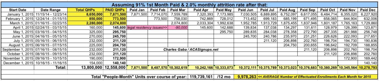 For 2015, back in November I speculated that the first-month payment rate would likely end up being somewhat higher than 88%, for a variety of reasons, including technical improvements and especially because around 1/2 of this year's enrollees are renewals from last year...and thus have already proven themselves to make their payments on a regular, reliable basis. In fact, many of them (including my wife and I) are set up with auto-payments. With that in mind, I speculated that the 2015 payment rate might conceivably end up being as high as 94%. However, I've stuck to my 88% guns in the absence of any hard evidence to the contrary.