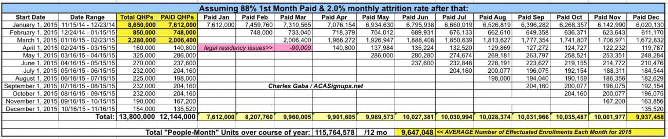 Here's the spreadsheets which explain where the monthly effectuated numbers come from. For the old version, I assumed an 88% payment rate, 2% monthly average net attrition and around 7,500 people enrolling during the off-season per day, plus about 140,000 tax filing-specific enrollments. As you can see, the effectuated March number is around 9.96 million:
