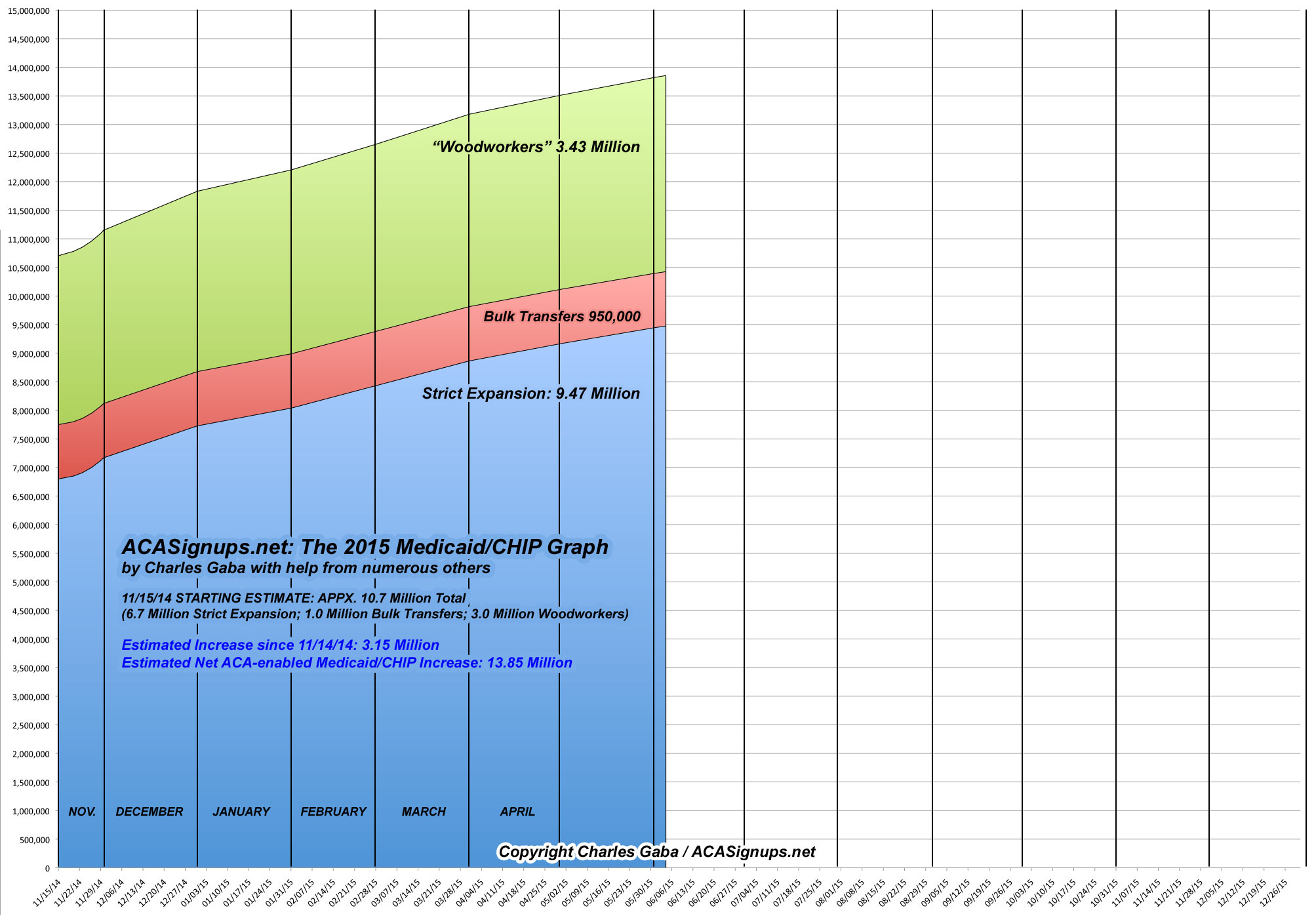 While everyone is waiting for the King v. Burwell decision to come out in a few weeks, the CMS Dept. has quietly released their latest monthly Medicaid/CHIP enrollment report...which happens to line up almost perfectly with what I was expecting: