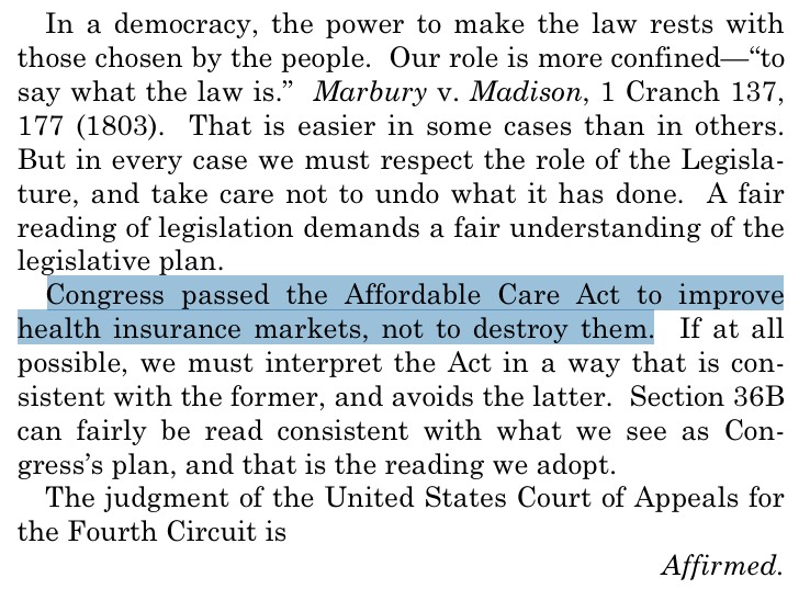 The fact that they didn't rely on the "Chevron deference" is also huge. Chevron would've meant that a future Republican/anti-ACA President and/or Treasury Secretary could, theoretically, reverse the "interpretation" of the tax credits after President Obama leaves office. By going with a "plain text" interpretation, SCOTUS makes it clear that the case was, to put it bluntly, a big ol' pile of crap in the first place.