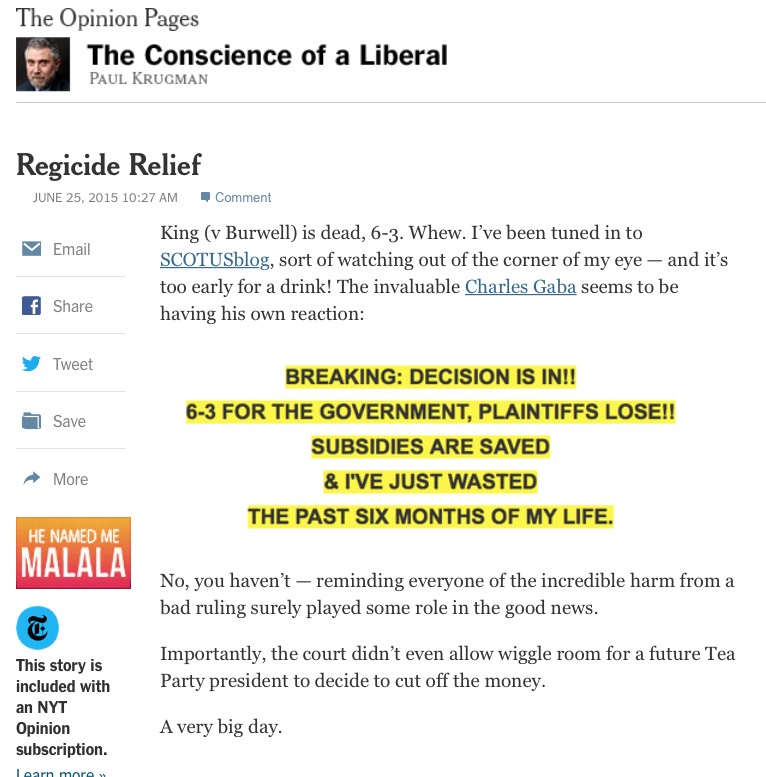 6/27/16: In light of the 1-year anniversary of the Supreme Court's King v. Burwell decision...along with the celebration of the Obergefell vs. Hodges decision and today's Whole Woman's Health v. Hellerstedt decision, I've dusted off this post from a year ago...