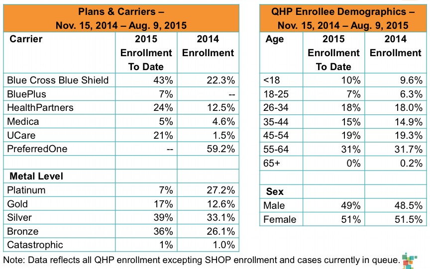 - The insurance provider market share breakdown is interesting, especially as it compares 2015 to 2014. With PreferredOne dropping out of the market, nearly 60% of the enrollees had to shop around, and it looks like they spread themselves out among BCBS, HealthPartners and UCare.