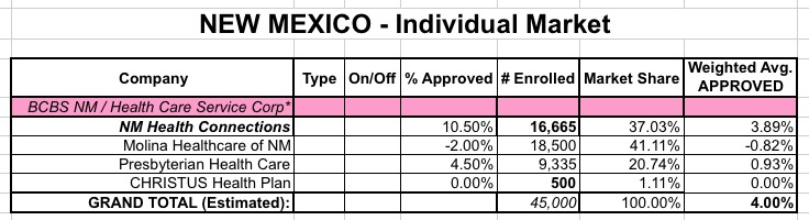 Officially, with BCBS off the table, this means that the "weighted average rate increase" for New Mexico's individual market has actually dropped dramatically for the other enrollees: From around 11.7% (or 24.5% if you use BCBS's 51% request) to just 4.0% or so: