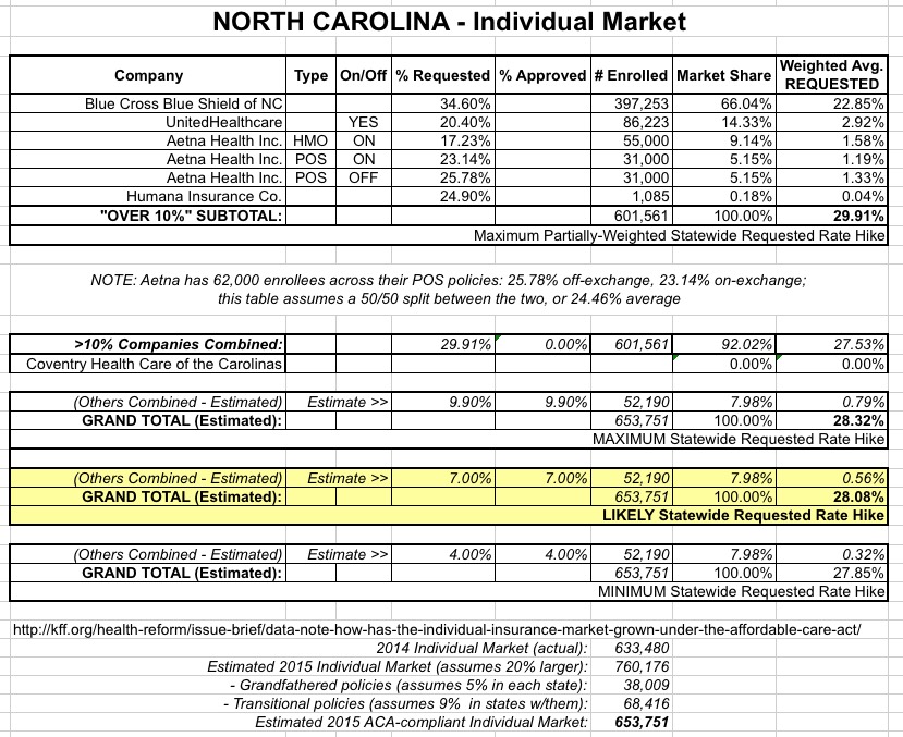 North Carolina: (revised) Requested 2016 avg. rate hikes: 28.1% (up from 27%)