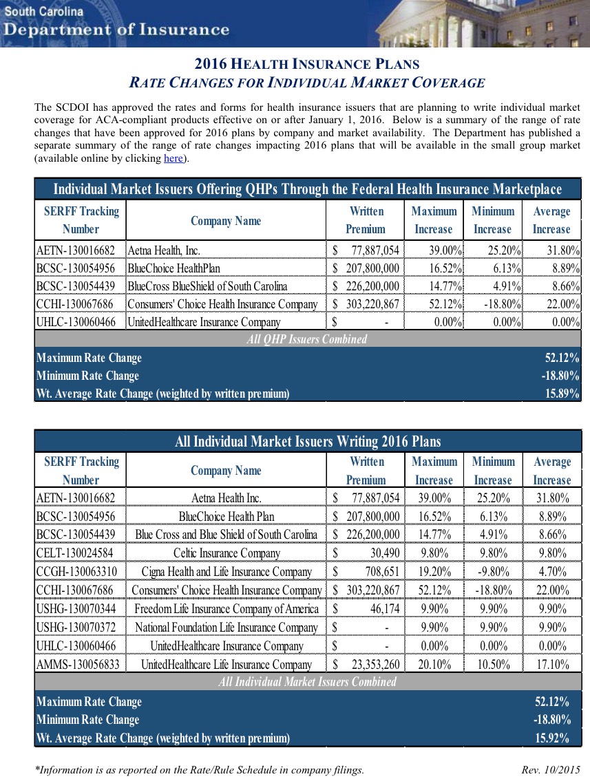 Well, the South Carolina Dept. of Insurance just released their approved 2016 rates, and they ended up pretty much splitting the difference.