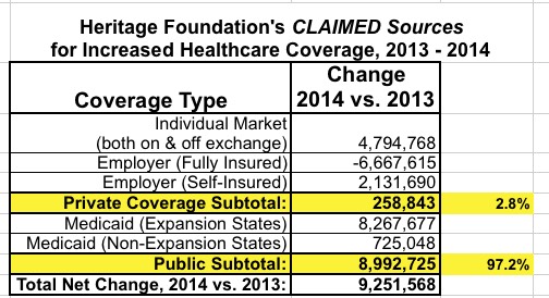However, I digress. Today's Heritage talking point tries to claim that over 97% of the net increase in Americans with healthcare coverage in 2014 was due to Medicaid/CHIP expansion, with less than 3% via the expansion of the private individual market (in particular, the ACA exchanges):