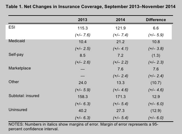 The larger point, however, is that there seems to be substantial evidence from a variety of reputable sources that Employer Sponsored Insurance did not drop noticeably between 2013 and 2014. (And why would it anyway? The ACA’s employer mandate wouldn’t kick in for another year.)