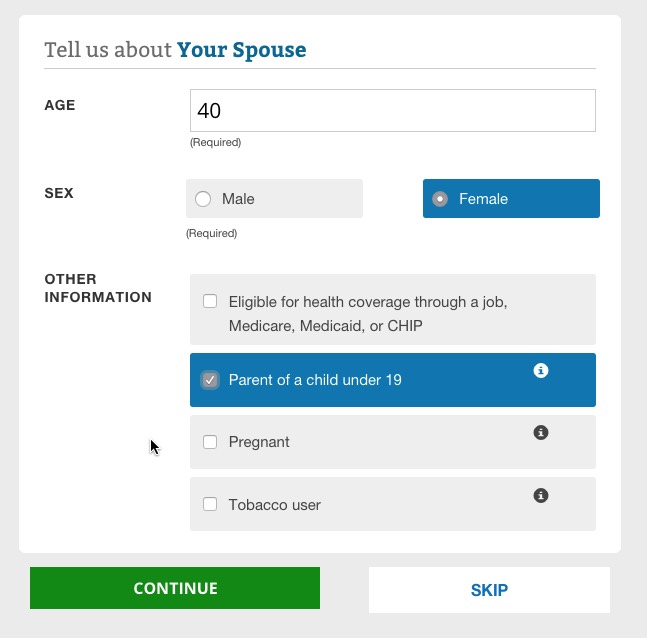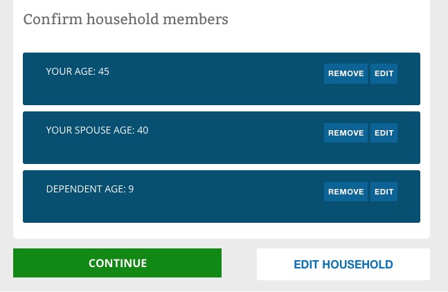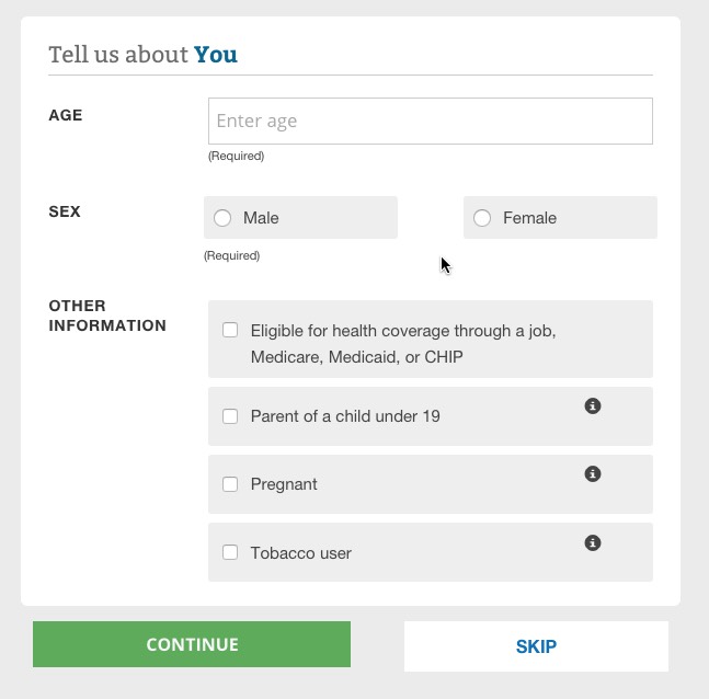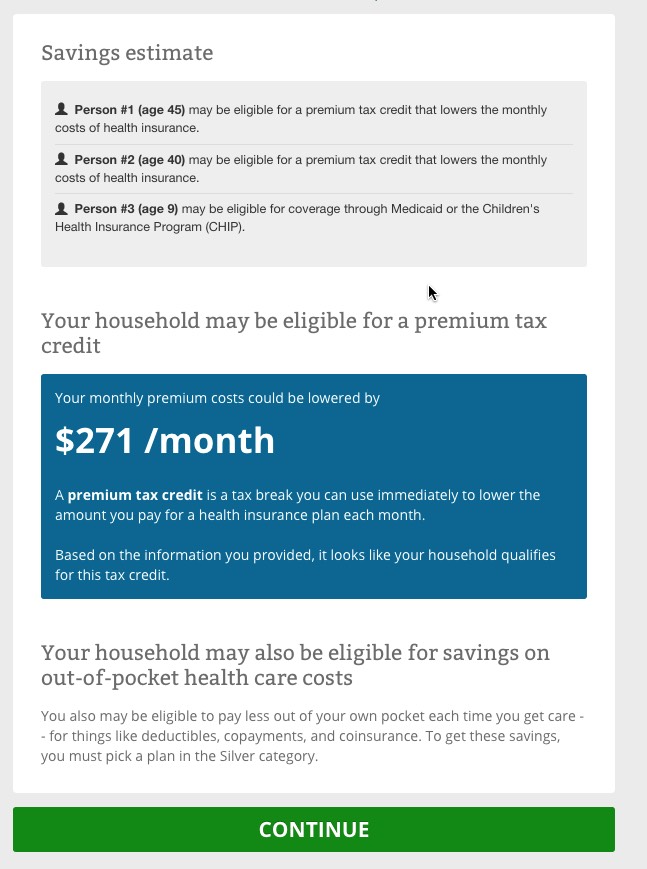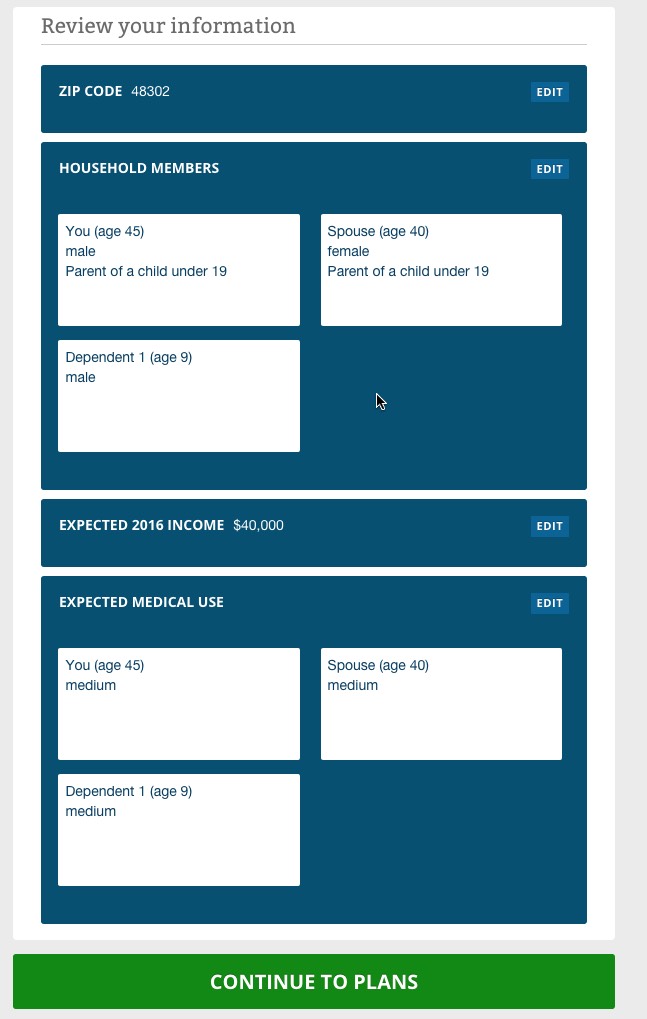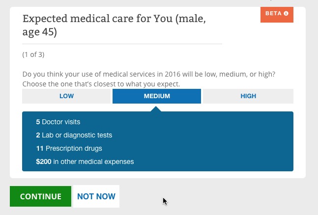 The way it works is pretty clever (and presumably modelled after similar tools on Covered California and a couple of other State-Based Exchanges. You choose from "Low", "Medium" or "High" expected medical needs for the upcoming year for each person in the household.