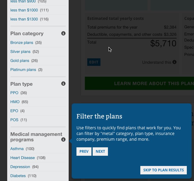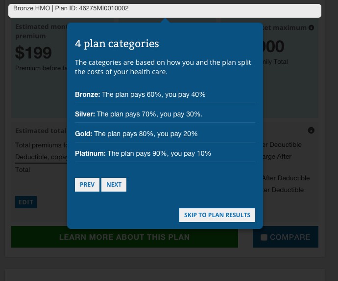 ...where they've added 4 new "Help Guides"...screen overlays to explain what the hell all of this stuff means (Copayments, Deductibles, Metal Levels and Out of Pocket vs. Premiums, as well as the Plan Filtering tool on the left sidebar):