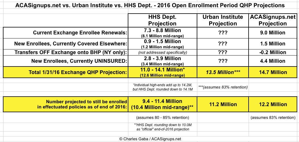 UPDATE: In addition, the Urban Institute just issued their own 2016 Open Enrollment Projection analysis. Unlike HHS and myself, they don't include a hard number for how many QHP selections they're expecting, nor do they break out their projection (expected renewals, expected transferrees, expected newly covered), but they do conclude as follows: