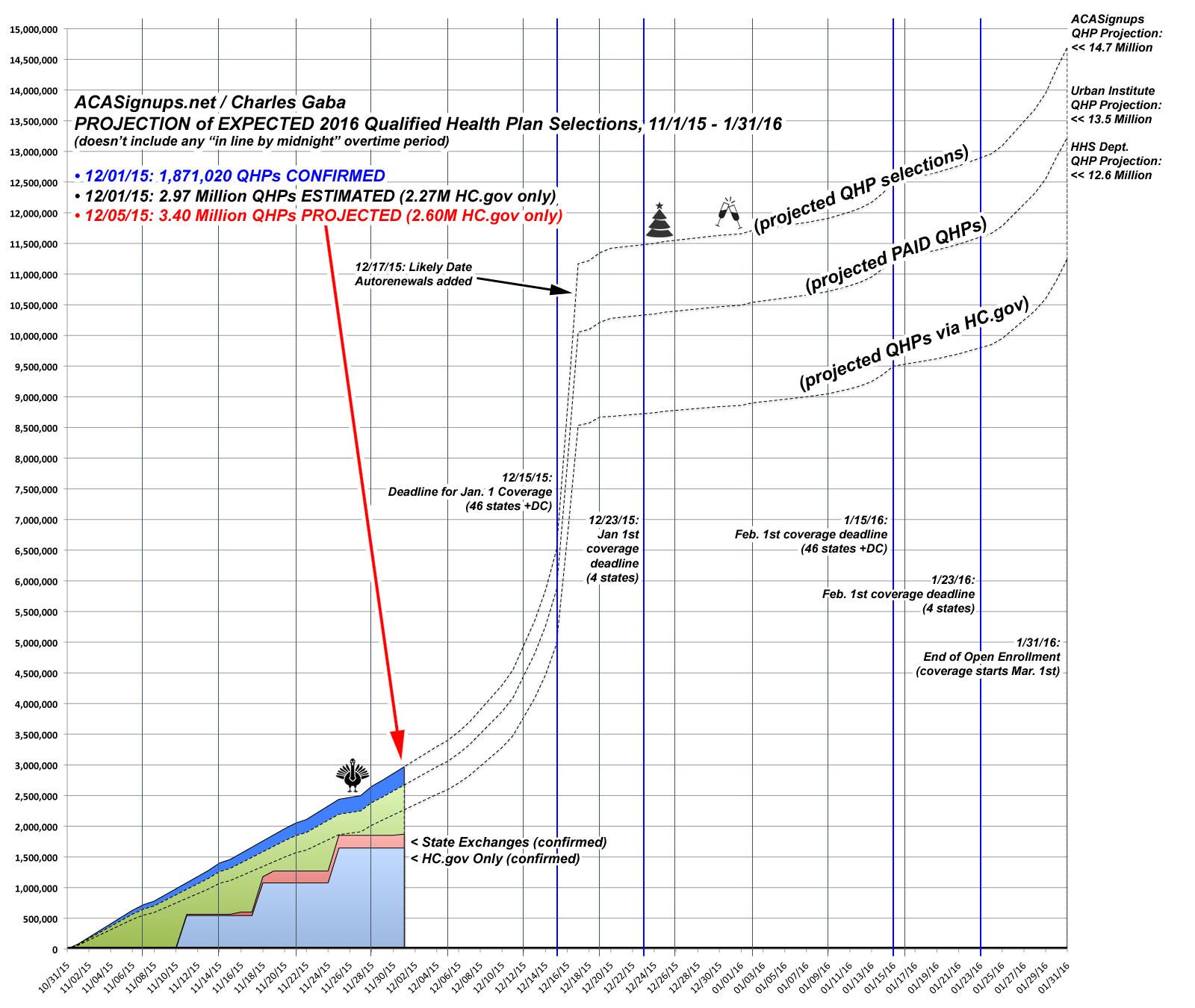 - There will likely be a bunch of headlines about how "Obamacare Enrollments Drop 30% in Fourth Week!!" which is technically true, but kind of stupid because last week included Thanksgiving. This has alrady been accounted for in my projections (see the flat line under the little turkey on The Graph?)