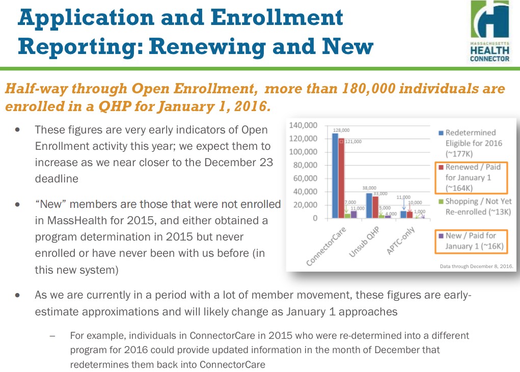 Yes, that's right: Over 180,000 Massachusetts residents have already been enrolled in exchange QHPs for January 1st coverage...and as you'll see below, this appears to only run through the end of November (although I'm not 100% certain that the dates on the slides above and below quite match up, not that it matters that much).