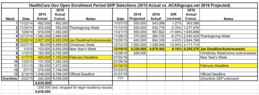 In addition, while these won't impact the federal exchange numbers, several state-based exchanges (Maryland, Massachusetts, Minnesota, New York, Rhode Island and Washington State) have/had January deadlines later than the 12/17 one on the federal exchange and some other states, so there's a lot of bumpy numbers going into Week Eight.