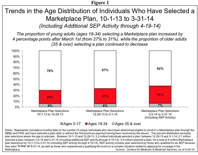As you can see, during the first 2 months, only 30% of enrollees were under 35; for the second two months, 33% were, and for the last 2 months (including the 2-week overtime period) it was up to 38%.