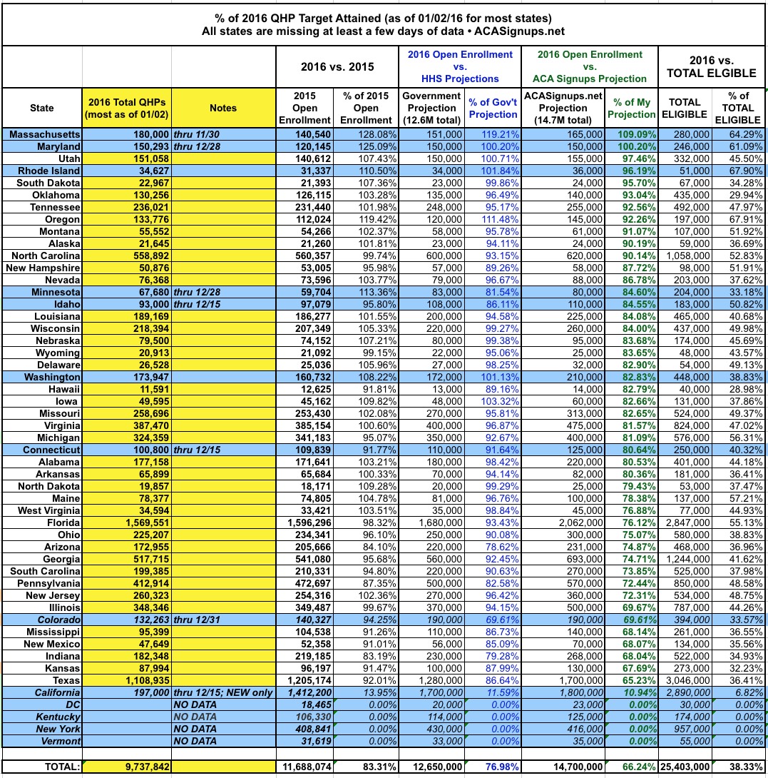 Overall, I've confirmed 9.74 million QHP selections nationally, but am pretty sure there's an additional 1.6 million already out there, likely as follows: