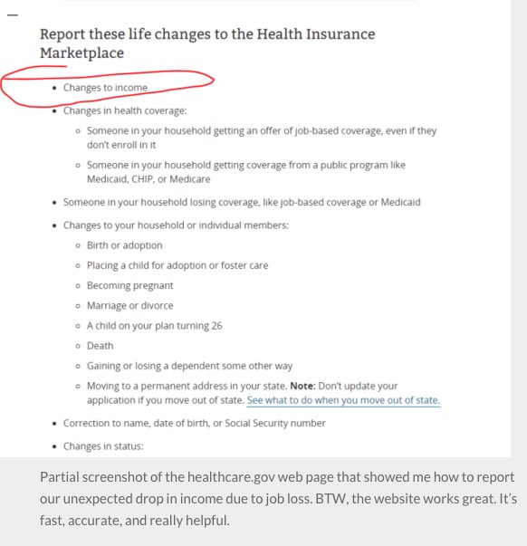 We used the exchange for the 3rd year in a row last month to renew our coverage for 2016, and we received a modest subsidy based on our projected income, and we were very grateful. Then I lost my job unexpectedly. Our family was able to exercise the provision of the law that allows people who experience a job loss to re-submit their online application and get a bigger subsidy to cover their health insurance costs. The amount of our subsidy has doubled, making our health insurance costs much more affordable during this uncertain and challenging time for us financially. If/when Melissa or I get our next job, we’ll have to report that change as well and then we’ll get a smaller subsidy, which is fair.