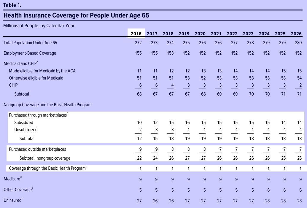 Other Nongroup Coverage. Outside the marketplaces, 9 million people are expected to purchase nongroup coverage in 2016, and 7 million people are expected to purchase such coverage in 2026. CBO and JCT believe that a number of people who are not eligible for subsidies for coverage through the marketplaces will continue to purchase nongroup coverage outside the marketplaces, in some cases through a broker or online. That number is projected to decline as experience with and enrollment through the marketplaces increases. Whether people who purchase unsubsidized nongroup coverage do so through a marketplace or directly from an insurer does not affect the federal budget.