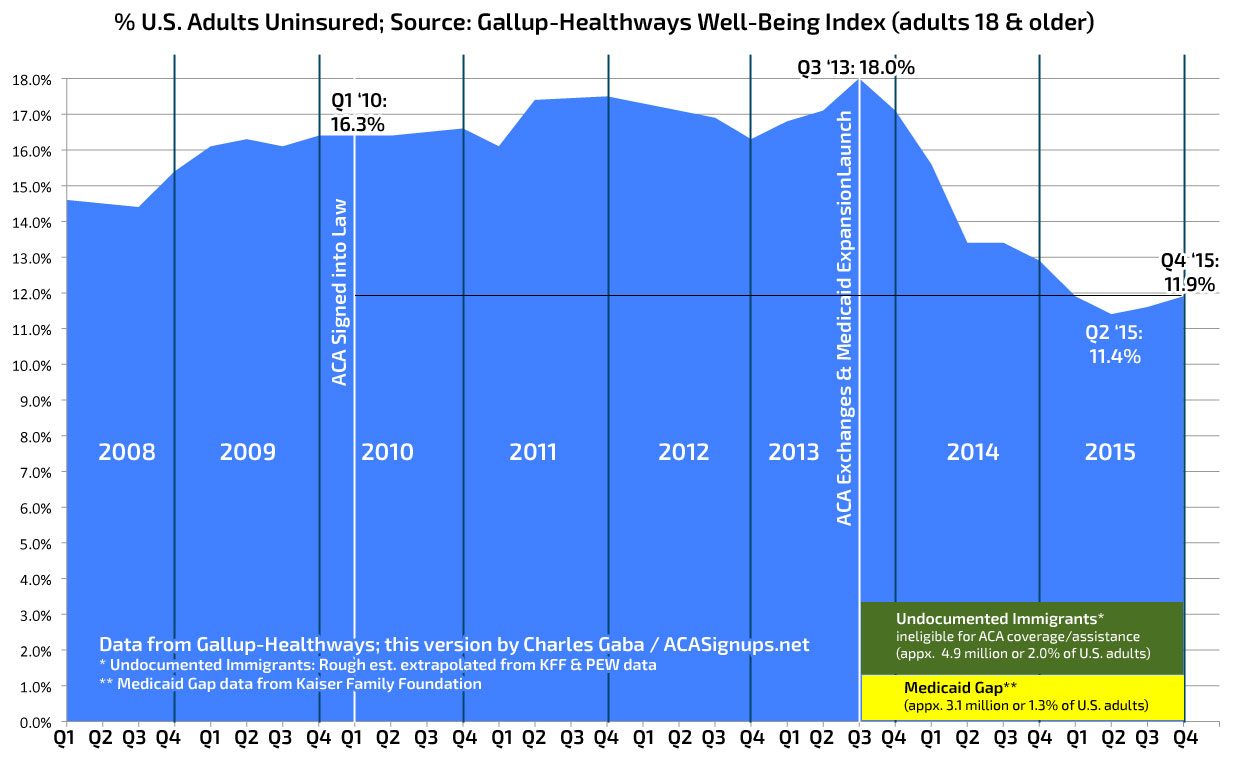 Here's what I wrote last July, when Gallup released their 2015 Q2 Uninsured Rate survey (which pegged the uninsured rate among adults (over 18) at 11.4%: