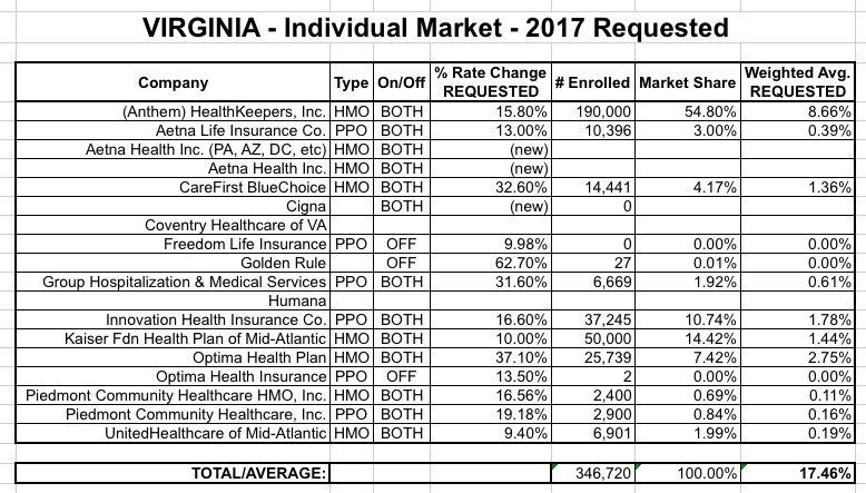 In any event, Humana and Coventry appear to be being dropped in Virginia's individual market, so without knowing how much their enrollees were paying (or where they'll move to next year), it's impossible to factor them into a weighted average. So, until further notice, it looks like I had it right in the first place: Virginia's requested average 2017 rate hike is around 17.9%.