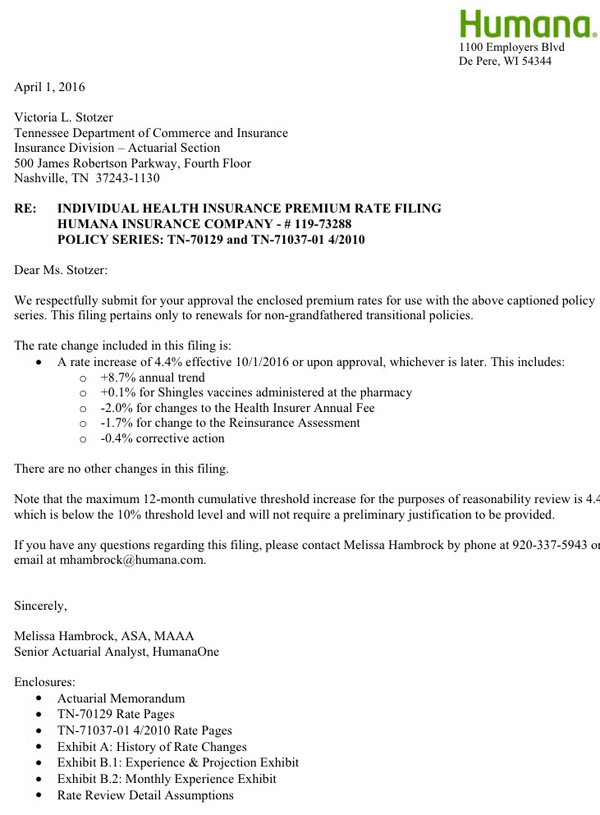 - Meanwhile, in Tennessee, I think Humana is sticking around next year, but this notification regardng a rate hike request for transitional policies only makes it difficult to be certain. At the very least, Ms. Rouse hasn't submitted an exit notice for 2017 yet (and yes, Humana is available on the exchange in Tennessee this year):