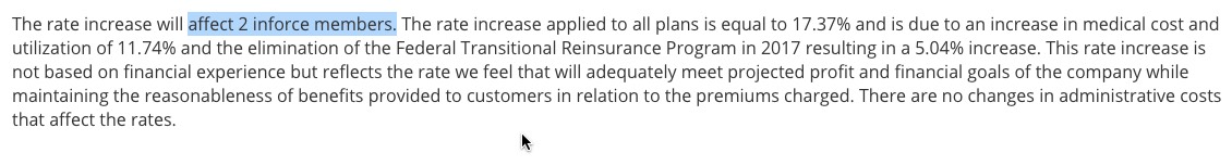 Yup, the rate impact is correct (64.87%) and the number of policyholders matches (81,261)...but look at the number of covered lives. This should obviously be at least as high as the policyholders, but should actually be somewhat higher, since each policyholder represents a household. Generally the covered lives should be around twice as high as the policyholder number...yet here they only add up to 52,933 people.