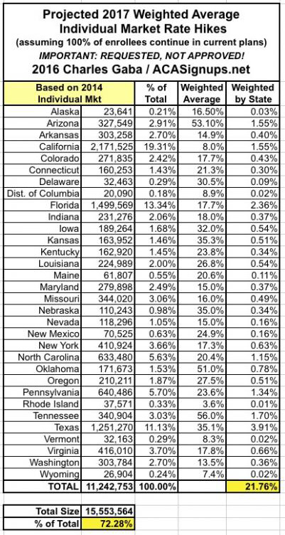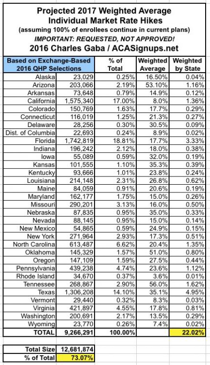 With that in mind, this seems like a good point to take a breather and see where things stand. The 31 states (+DC) that I've analyzed represent either 70%, 72% or 73% of the country depending on whether you base it on the total population, the size of the individual insurance policy market or the total number of QHP selections via the exchanges. I've broken the 3 tables into separate images below to avoid having to click for a higher res version: