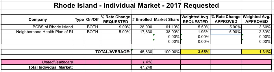 Rhode Island, in addition to being one of the smallest states, is also one of the first states I crunched the rate hike numbers for back in late May. It was actually pretty easy to run a weighted average hike request since there are only 2 carriers even operating on the individual market next year: Blue Cross Blue Shield of RI and Neighborhood Health Plan (UnitedHealthcare is dropping out of the RI indy market entirely, but only has about 1,400 people enrolled to begin with).
