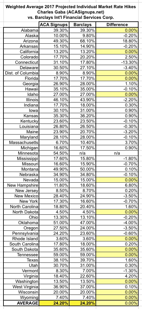This is my official Projected 2017 Weighted Average Individual Market Rate Hike spreadsheet. While the specific state data (requested) has changed slightly, it's still virtually identical to the data I posted back on August 8th: