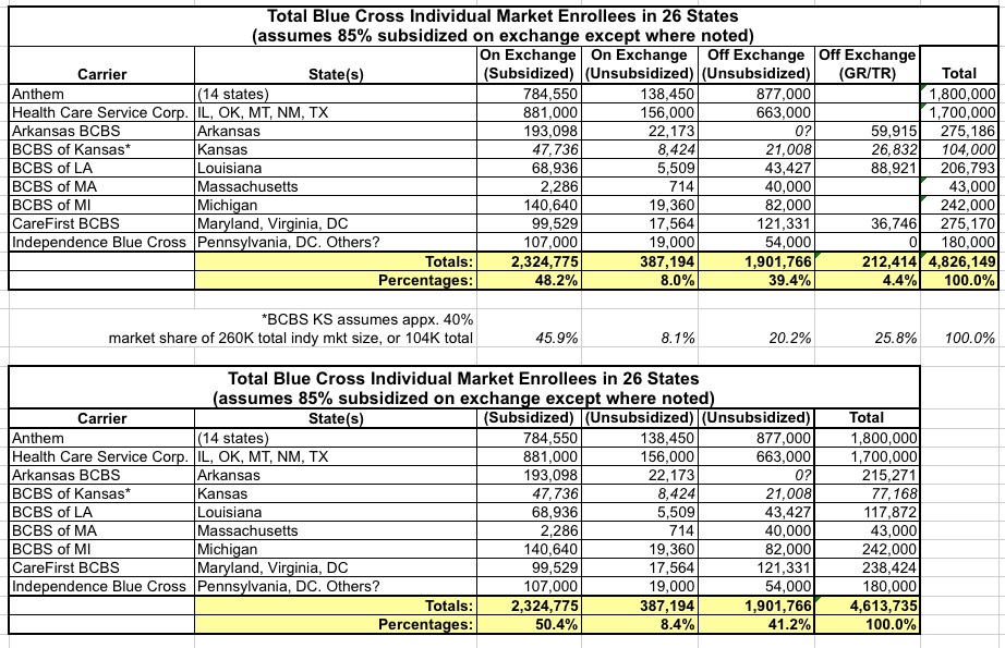 Laszewski gives hard number breakouts of Davis' findings for 7 Blues companies which operate across 26 different states. In cases where the actual subsidized number isn't available, he uses the "85% of exchange-based are subsidized" figure (I've adjusted this for individual states where possible, such as Arkansas, Kansas, Louisiana, Massachusetts & Michigan). In the case of Kansas, he had all the percentages but not the grand total; I assumed BCBSKS holds around 40% of the individual market in KS based on their pre-ACA 2013 share (this has likely shifted by now but it's the best I can do), and I assumed the total KS indy market stands at roughly 260,000 people based on updated data from Mark Farrah Associates (see update below).