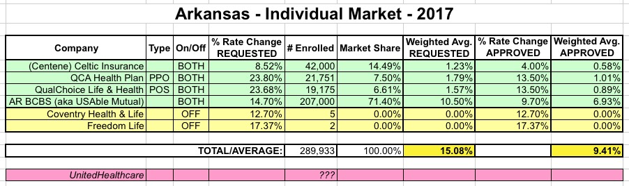I've updated the table with these revisions/updates; here's what it looks like now. I've also started color-coding the carriers...Green = available on/off the exchange; Yellow = available off-exchange only; Red = dropping out of the exchange and/or off-exchange indy market completely next year: