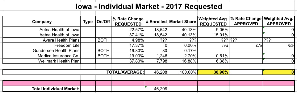 So really, this massive 38-43% rate hike officially impacts 30,000 people, or roughly 19% of Iowa's entire individual market. The hikes for the other 130,000 people (90K grandfathered/transitional, 40,000 via Coventry/etc) are still unknown.