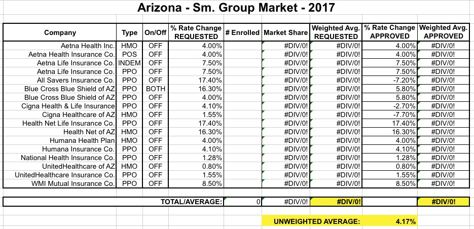 The ACA exchange in Arizona has had some pretty dramatic turns over the past month or so. When the dust settled, every county in the state will still have at least one carrier offering plans on the exchange...although only one. Anyway, today the AZ DOI joined Pennsylvania and Michigan in releasing their final approved rate hikes for both the individual and small group markets: