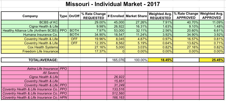 I'm not going to go into a whole lot of detail here, but I will post the updated spreadsheet tables for all five of these states. Combined, they actually bump the national average closer to 26% (mainly due to Texas's 34.1% average), but bear in mind that the requested average rate hikes for four of the still-missing five states came in well below 20%: