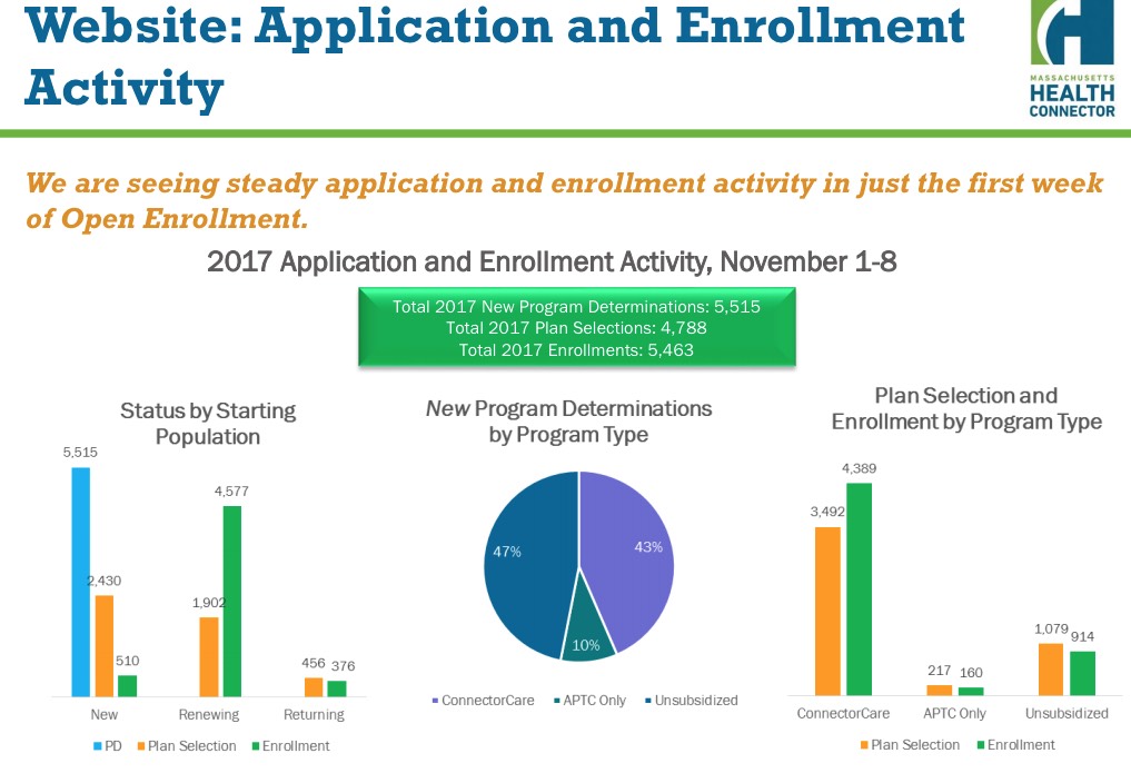 Today I was informed that as of November 8th, they had a grand total of 2,942 new QHP selections via the state exchange...of which 510 are fully enrolled (i.e., they've paid their January premiums already). This does not, however, include any renewals / re-enrollments by current enrollees, which could be substantially higher.